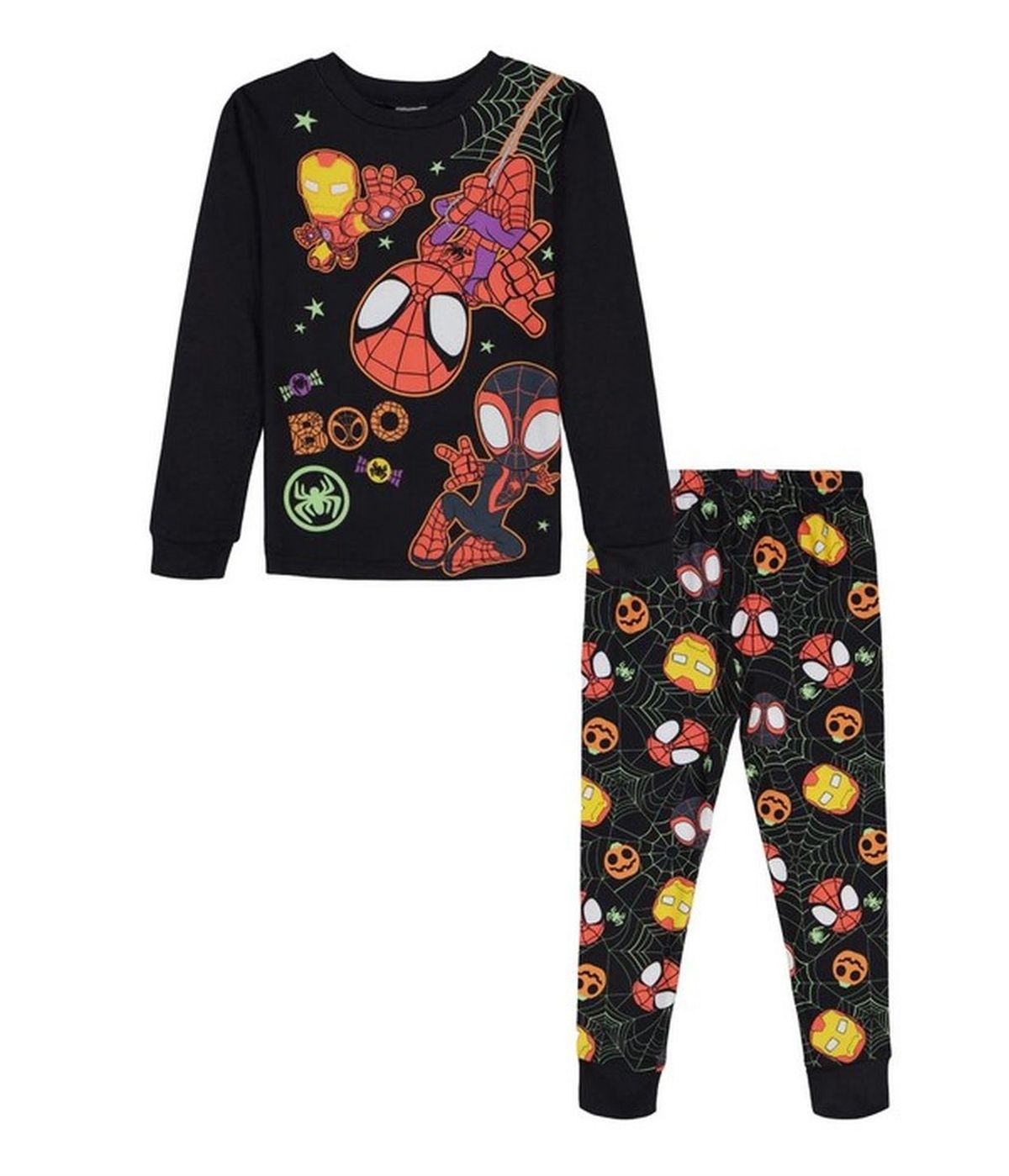 This spookily cute Halloween-themed pajama set features his favorite Marvel heroes in a fun and dimensional graphic and print. The pajama top has a roomy rib-knit collar and long sleeves in black. An elasticized waistband on the coordinating print pajama pants lends for a custom fit. Plus, it's crafted of a super soft, lightweight fabric of 95% Polyester and 5% Spandex for a great stretch. He'll be warm and comfy while he spends the haunting season with his Marvel friends.
